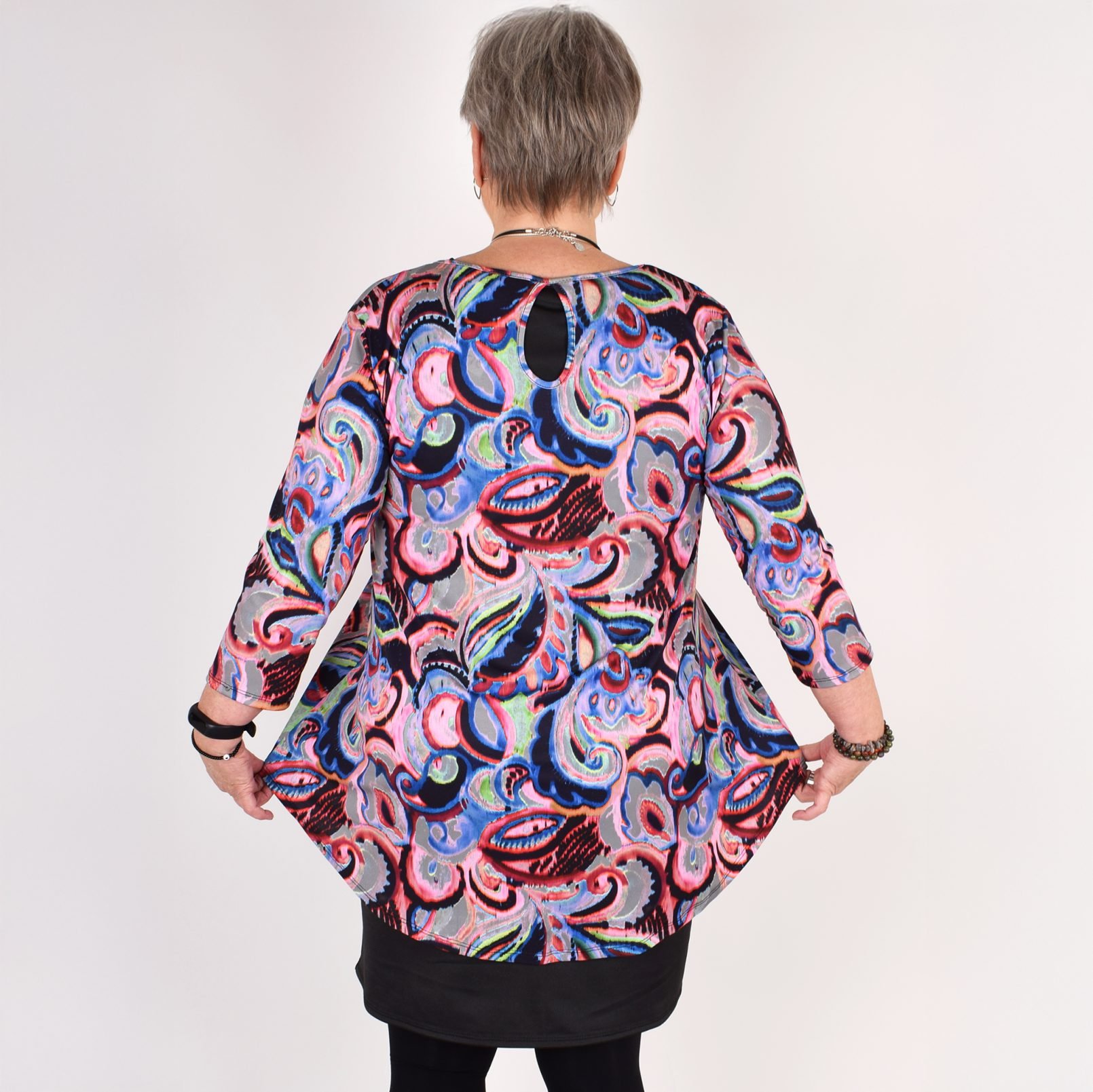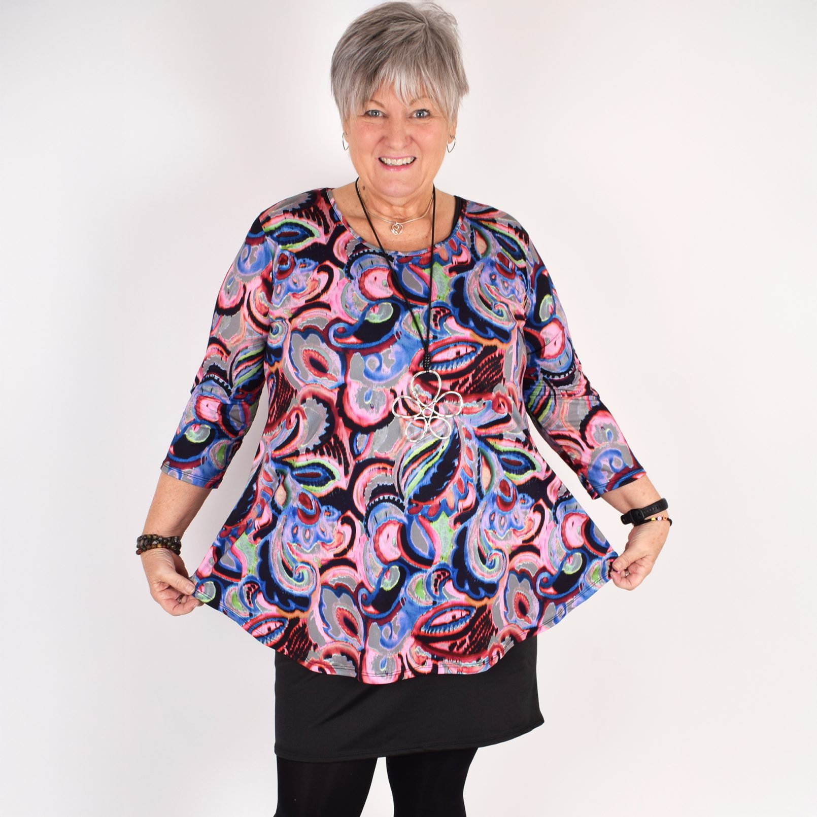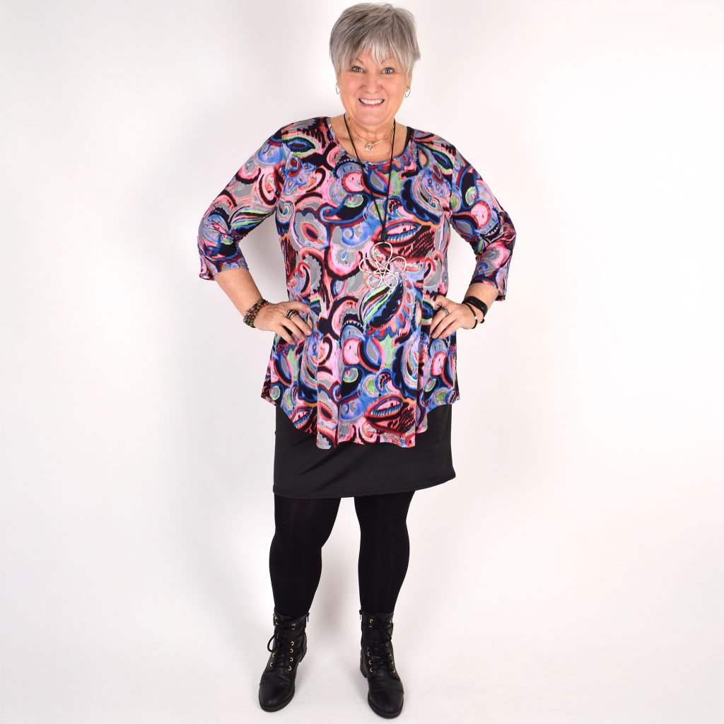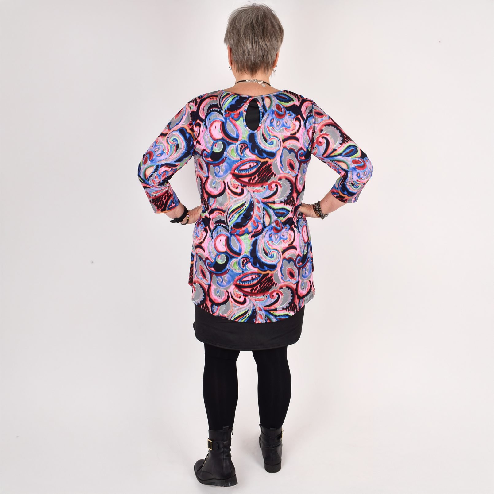 A-line tunic ‘DORIS’ with a nice pattern. This model is slightly longer at the back, featuring a rounded hem and a lovely loop detail at the back of the neck. ‘DORIS’ has a round neckline and 3/4-length sleeves, offering an elegant and comfortable fit. The material is incredibly stretchy, making it perfect for all body types. Pair it with your favourite trousers or leggings for a complete look. Marie, the model in the pictures, is wearing size L-XL.