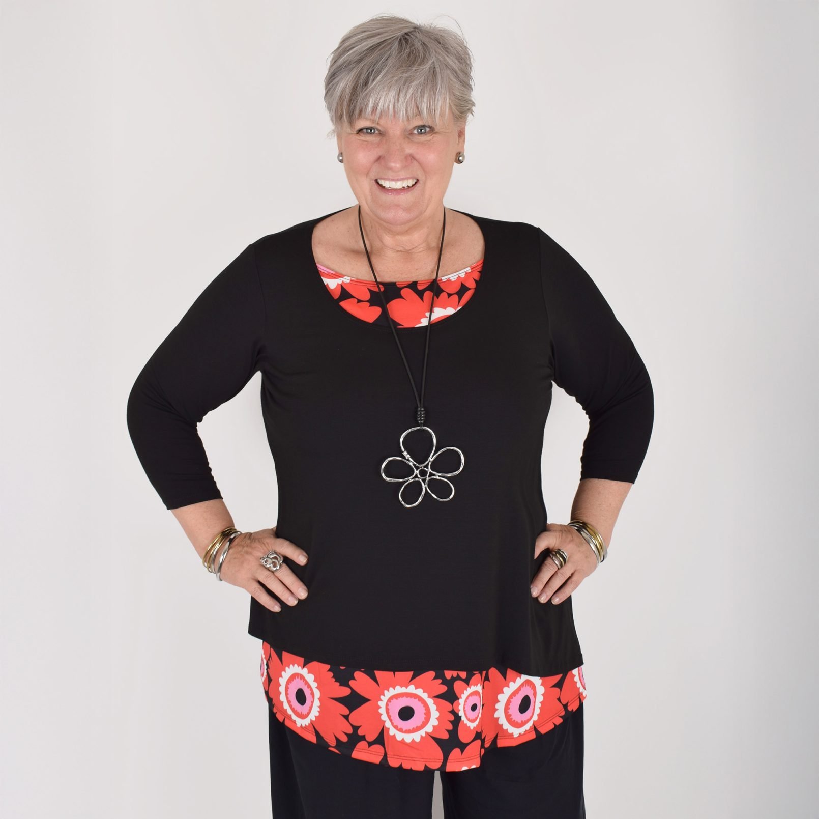 Musta kerroksellinen pusero ’RUT’ on tyylikäs valinta arkeen ja juhlaan. Puserossa on kuviollinen alaosa, joka pilkottaa kauniisti pyöreästä kaula-aukosta ja helman alta. 3/4 hihat ja koristeellinen kiila helmassa lisäävät puseron viehättävyyttä. Tämä A-mallinen pusero sopii kaikille vartalotyypeille, ja se tarjoaa mukavuutta ja tyyliä. Kuvissa Marie käyttää kokoa L-XL.