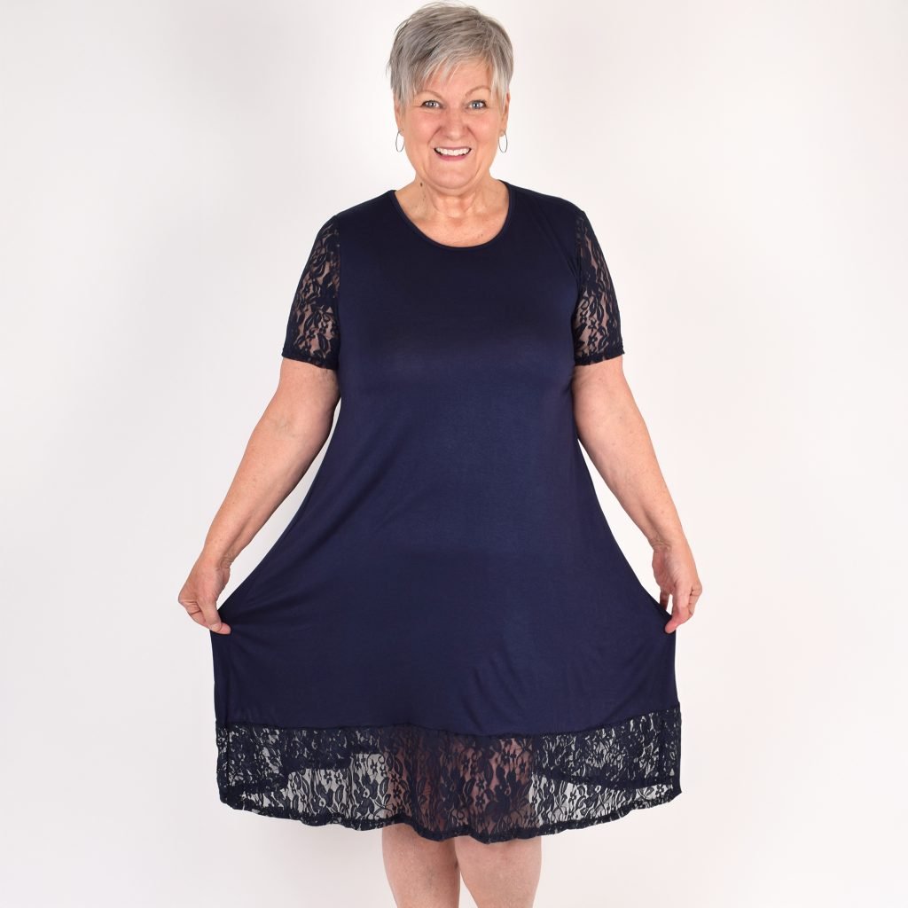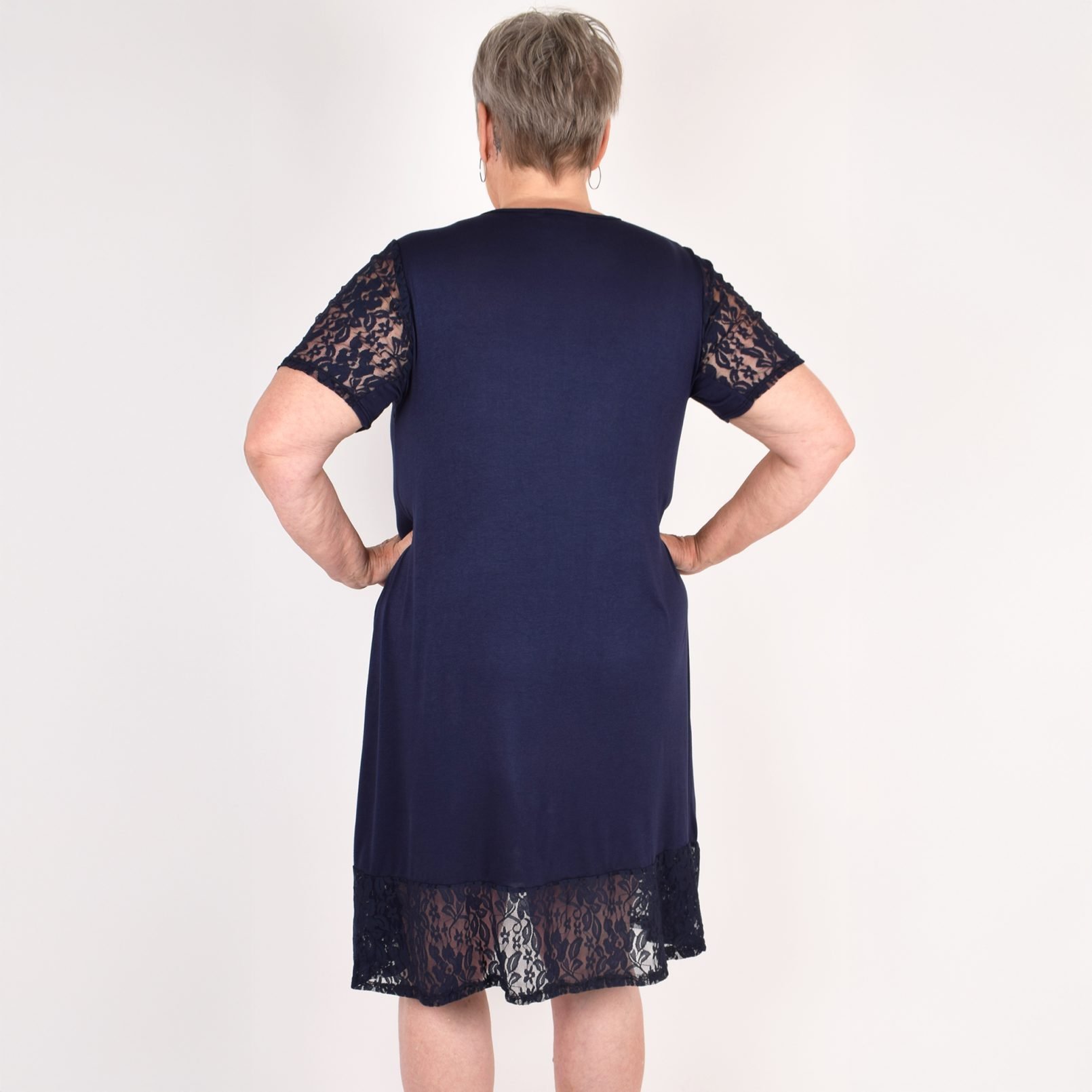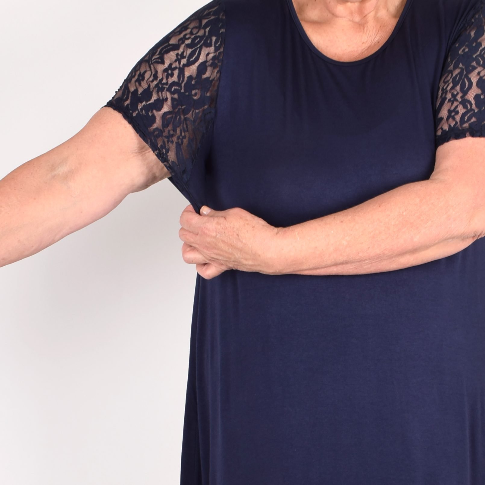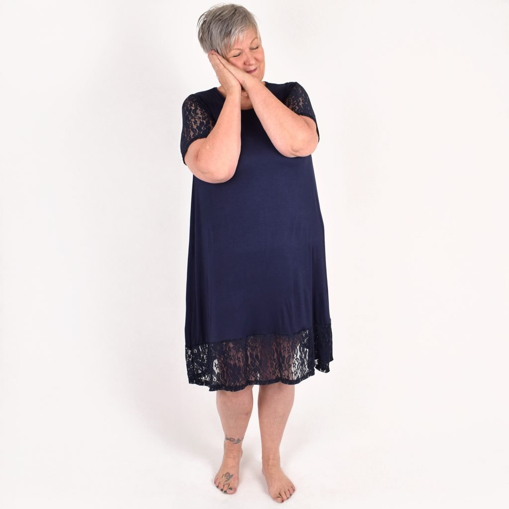 Härligt mörkblått nattlinne i mjuk och skön viskos. Nattlinnet har spetsdetaljer på ärmarna. Nattlinnet är onesize (M-3XL) och materialet är mycket strechigt.
