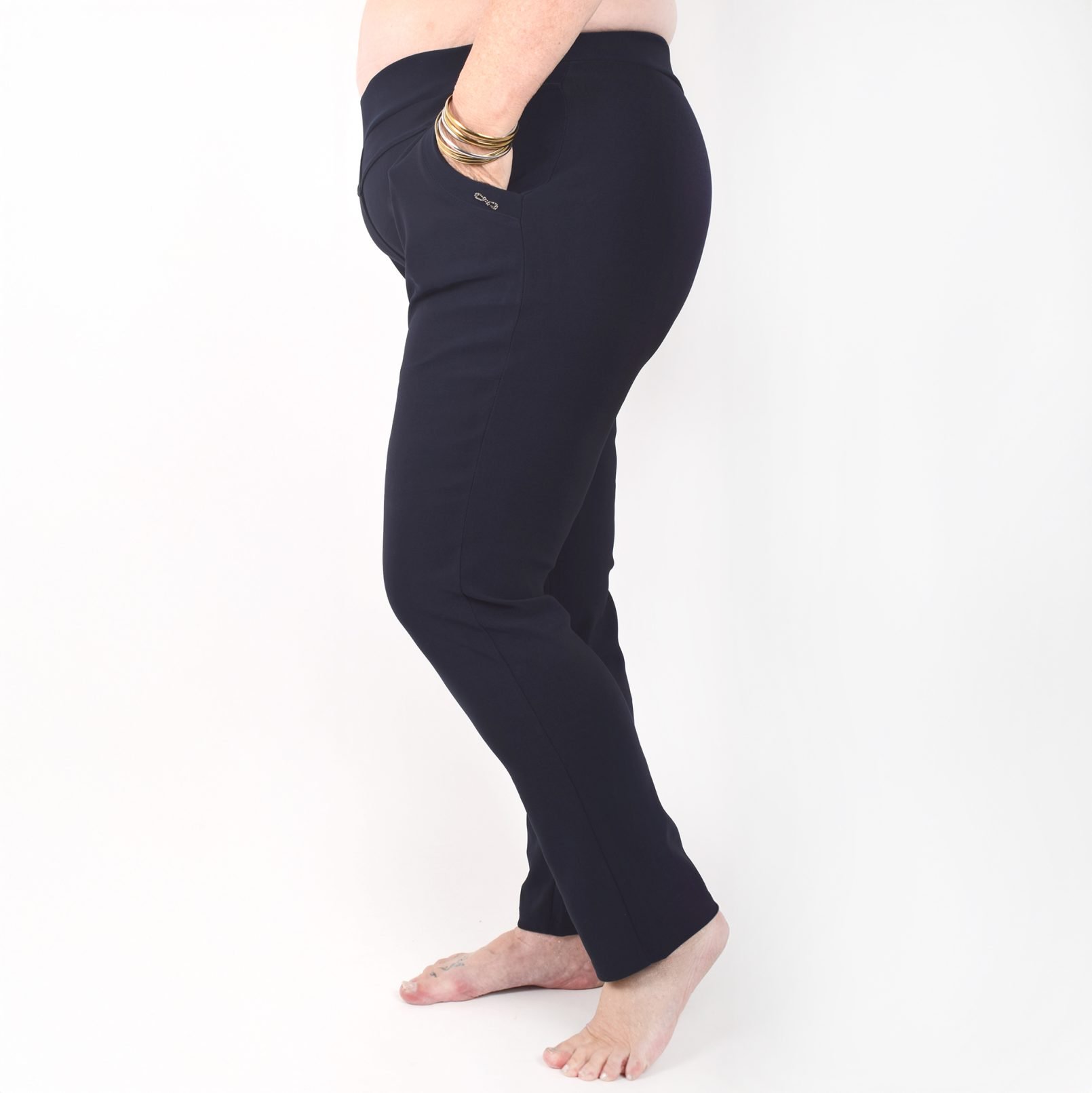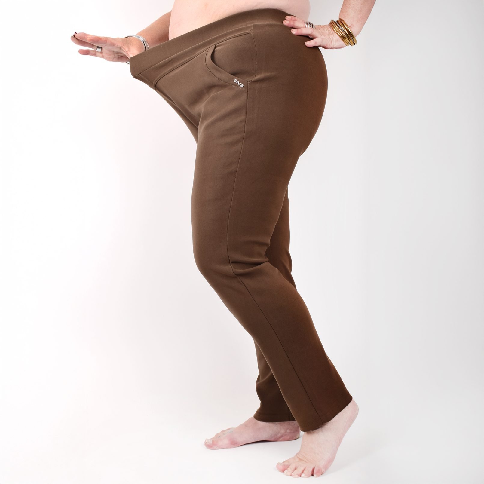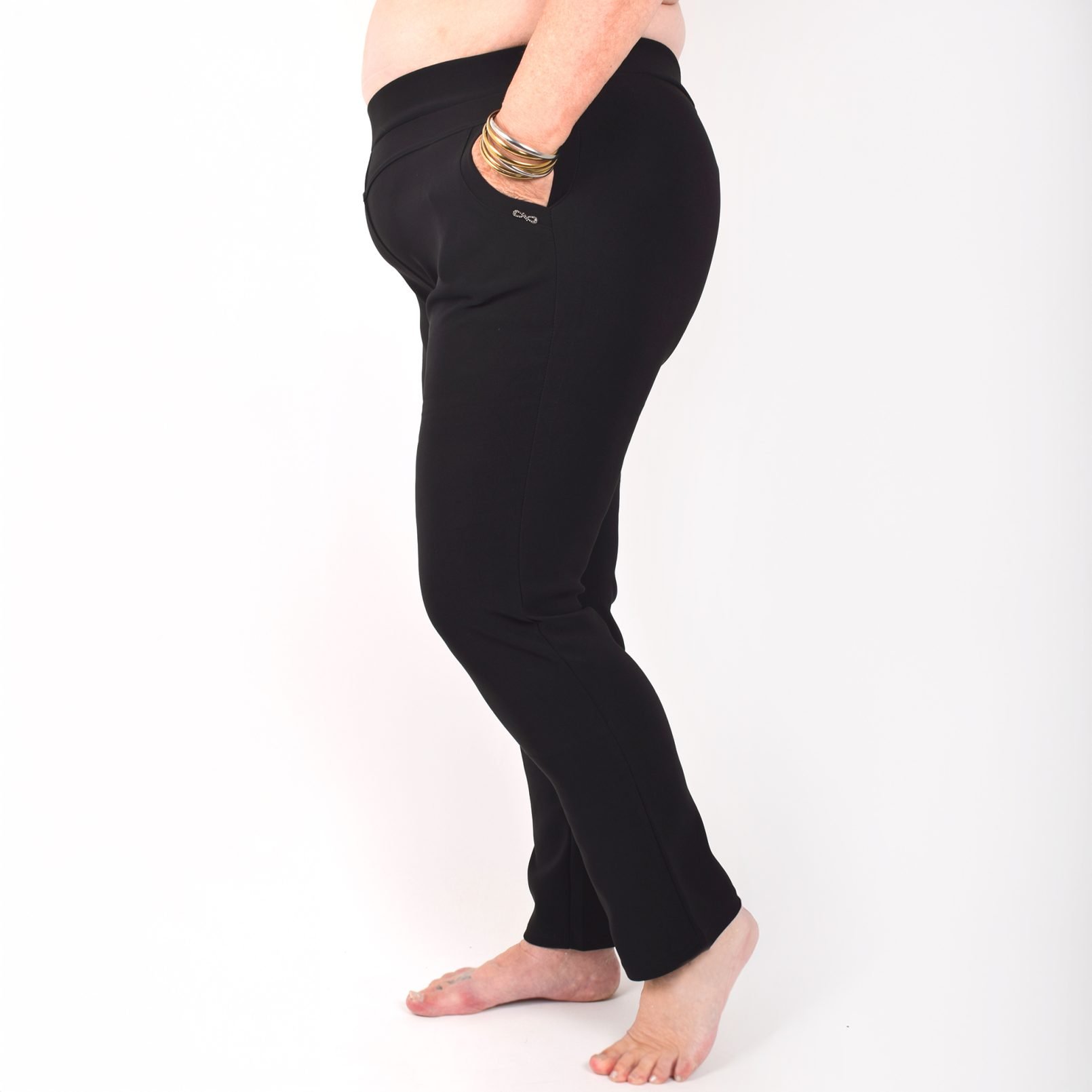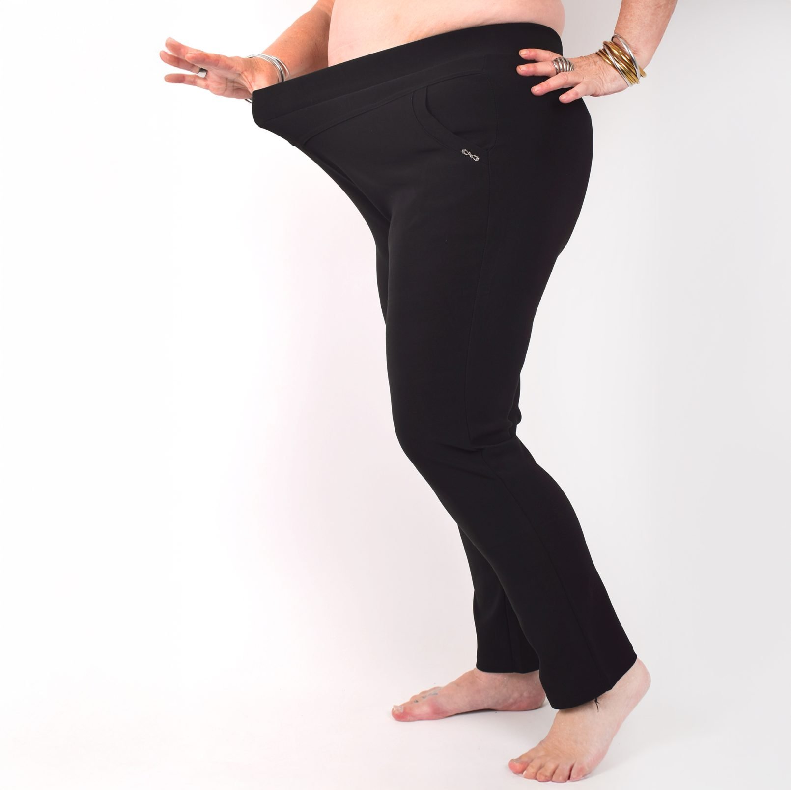 Stretchbyxor ’NINNA’ med detaj på fickorna. Fickor framtill. Bekväm passform, hög midja och superstretchigt material. Raka, lite avsmalnande ben. Stretchar ordentligt, så vill du ha tightare byxor kan du välja en storlek mindre än vanligt. Tvätta innan du tar byxorna i bruk. Maries (169 cm) storlek är XL. Byxornas längd är 110-104 cm och innerbenslängden 68-72cm.