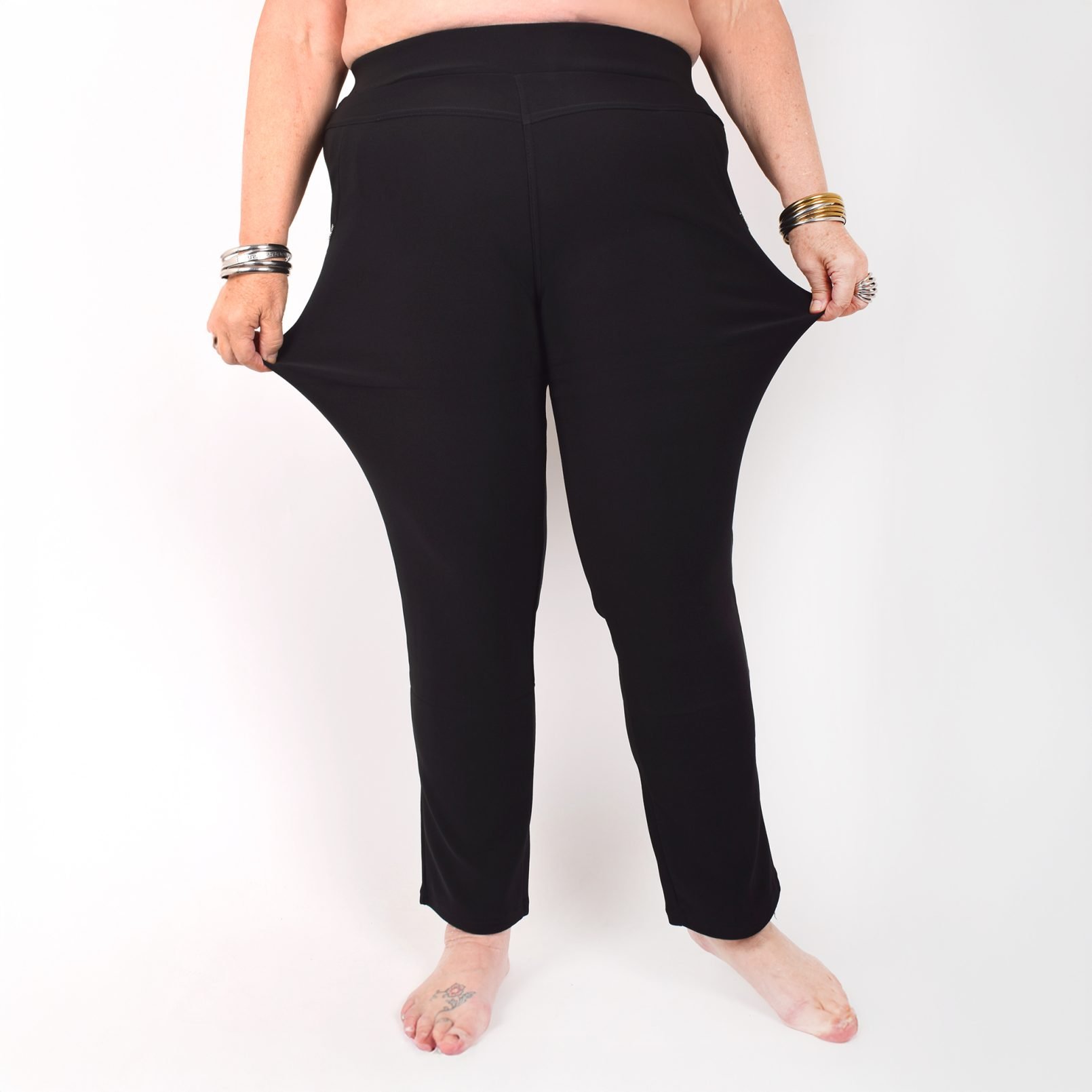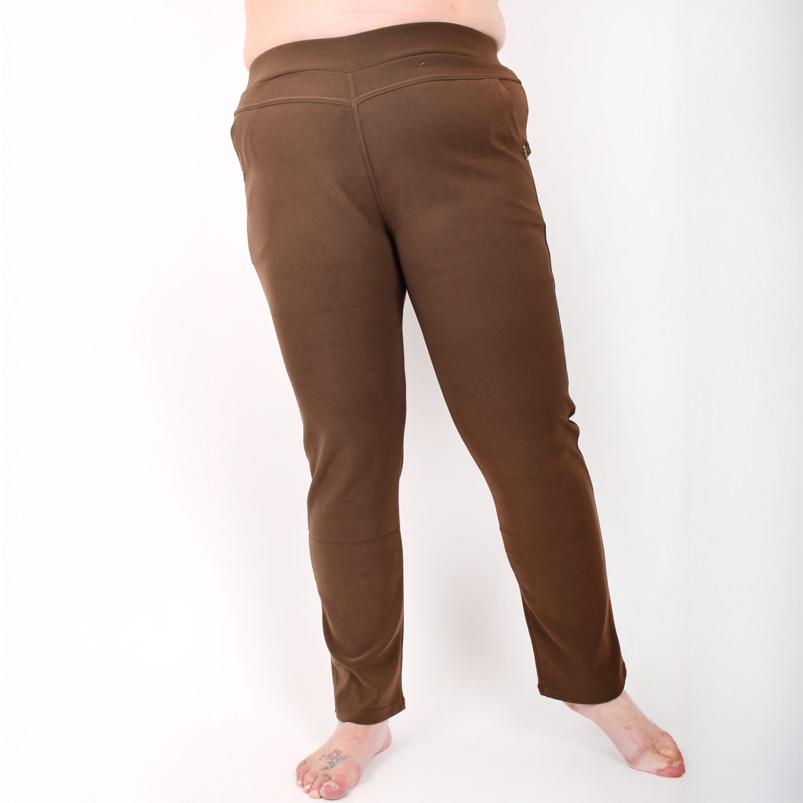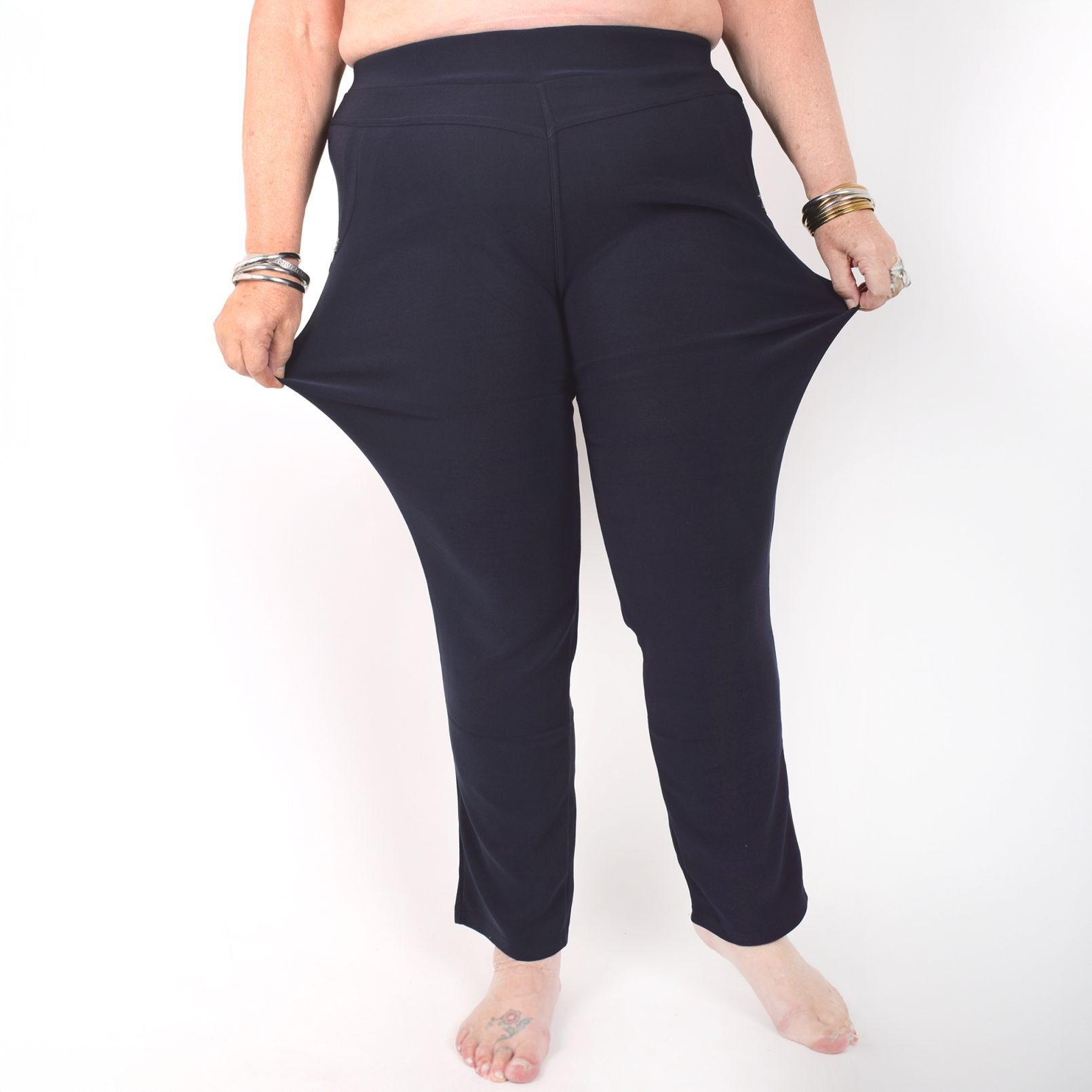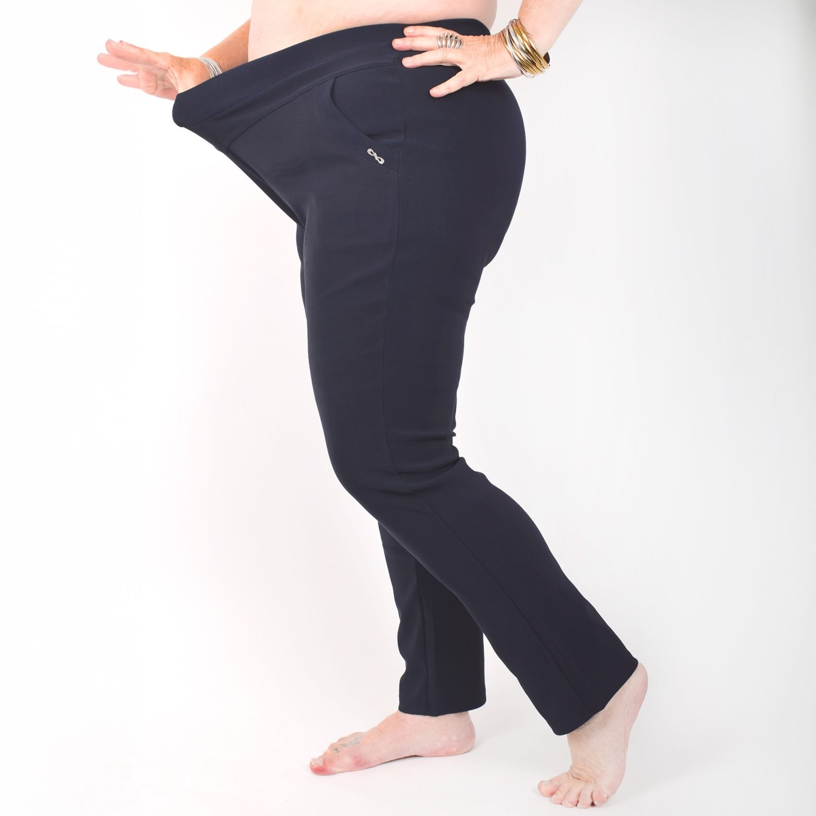 Stretchbyxor ’NINNA’ med detaj på fickorna. Fickor framtill. Bekväm passform, hög midja och superstretchigt material. Raka, lite avsmalnande ben. Stretchar ordentligt, så vill du ha tightare byxor kan du välja en storlek mindre än vanligt. Tvätta innan du tar byxorna i bruk. Maries (169 cm) storlek är XL. Byxornas längd är 110-104 cm och innerbenslängden 68-72cm.