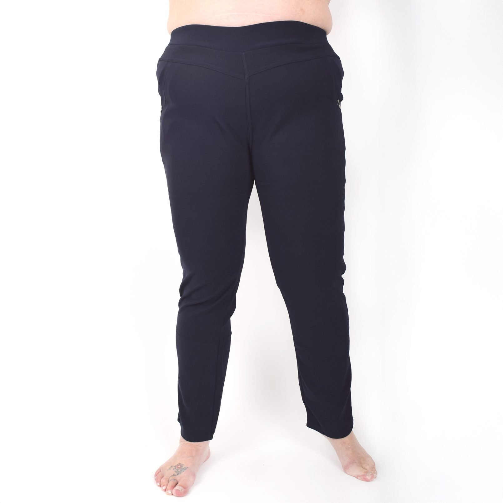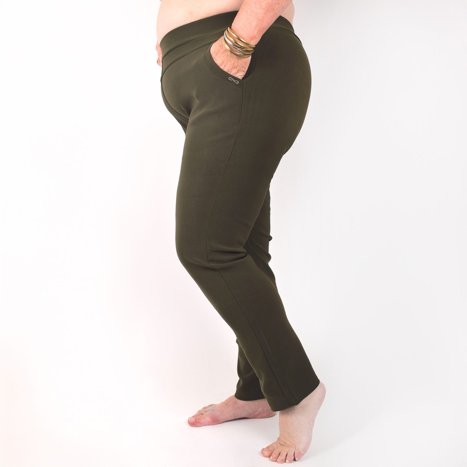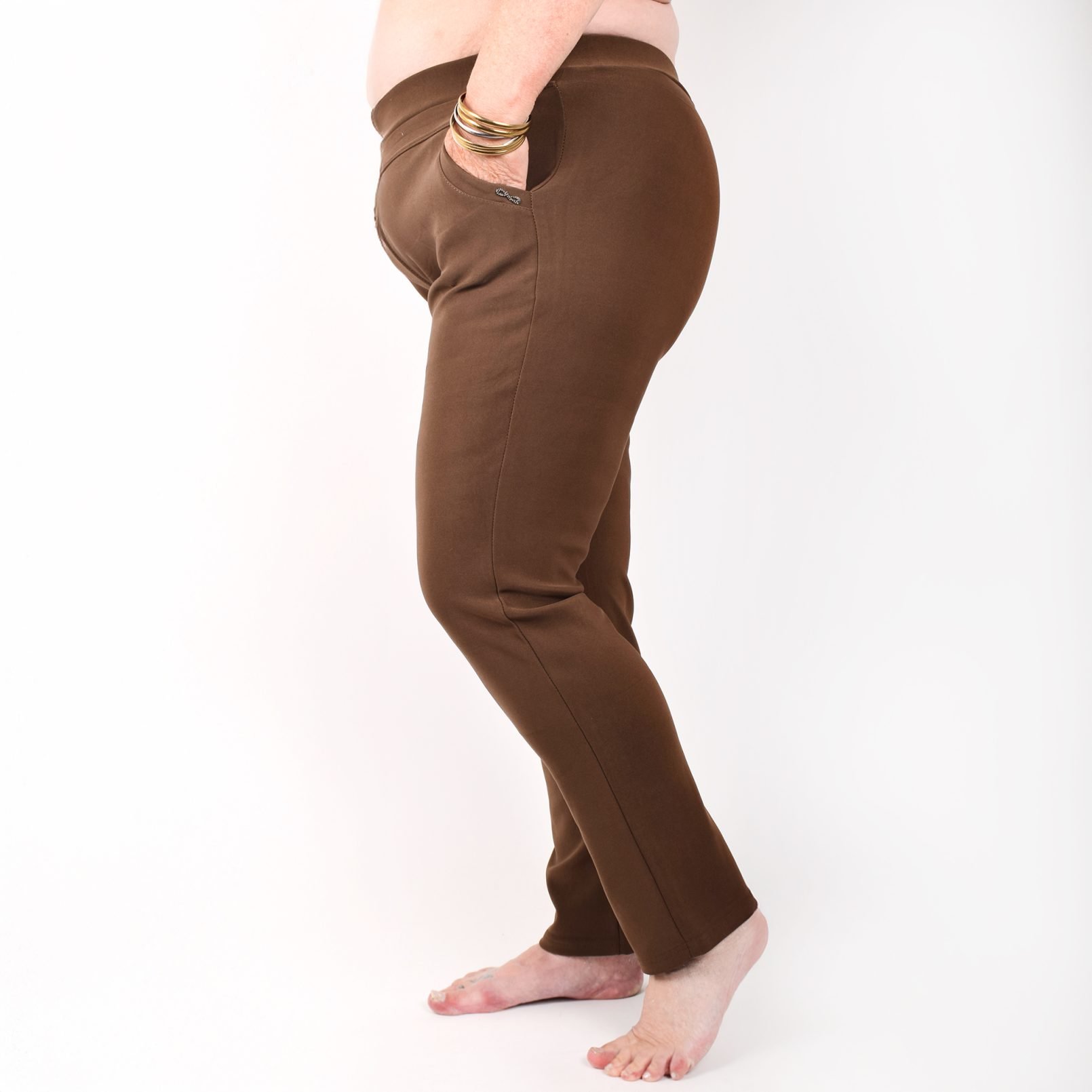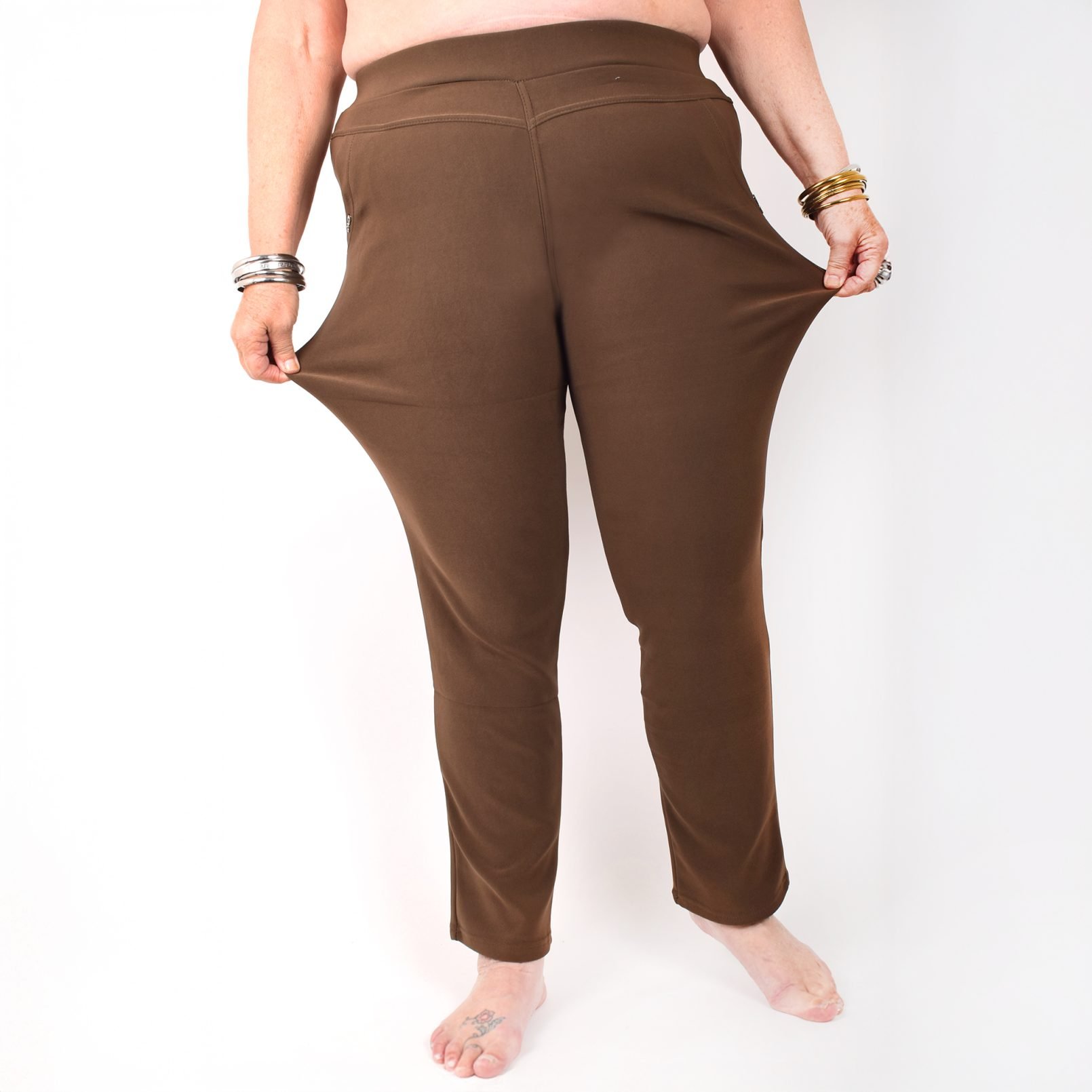 Stretchbyxor ’NINNA’ med detaj på fickorna. Fickor framtill. Bekväm passform, hög midja och superstretchigt material. Raka, lite avsmalnande ben. Stretchar ordentligt, så vill du ha tightare byxor kan du välja en storlek mindre än vanligt. Tvätta innan du tar byxorna i bruk. Maries (169 cm) storlek är XL. Byxornas längd är 110-104 cm och innerbenslängden 68-72cm.