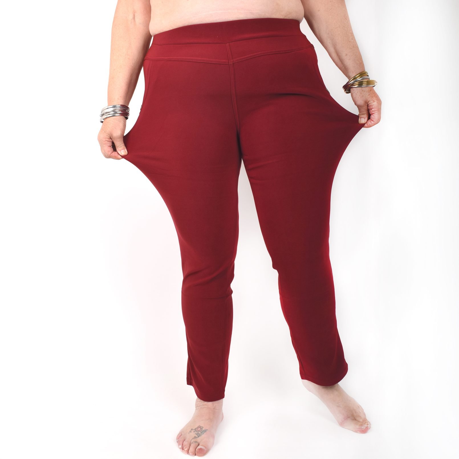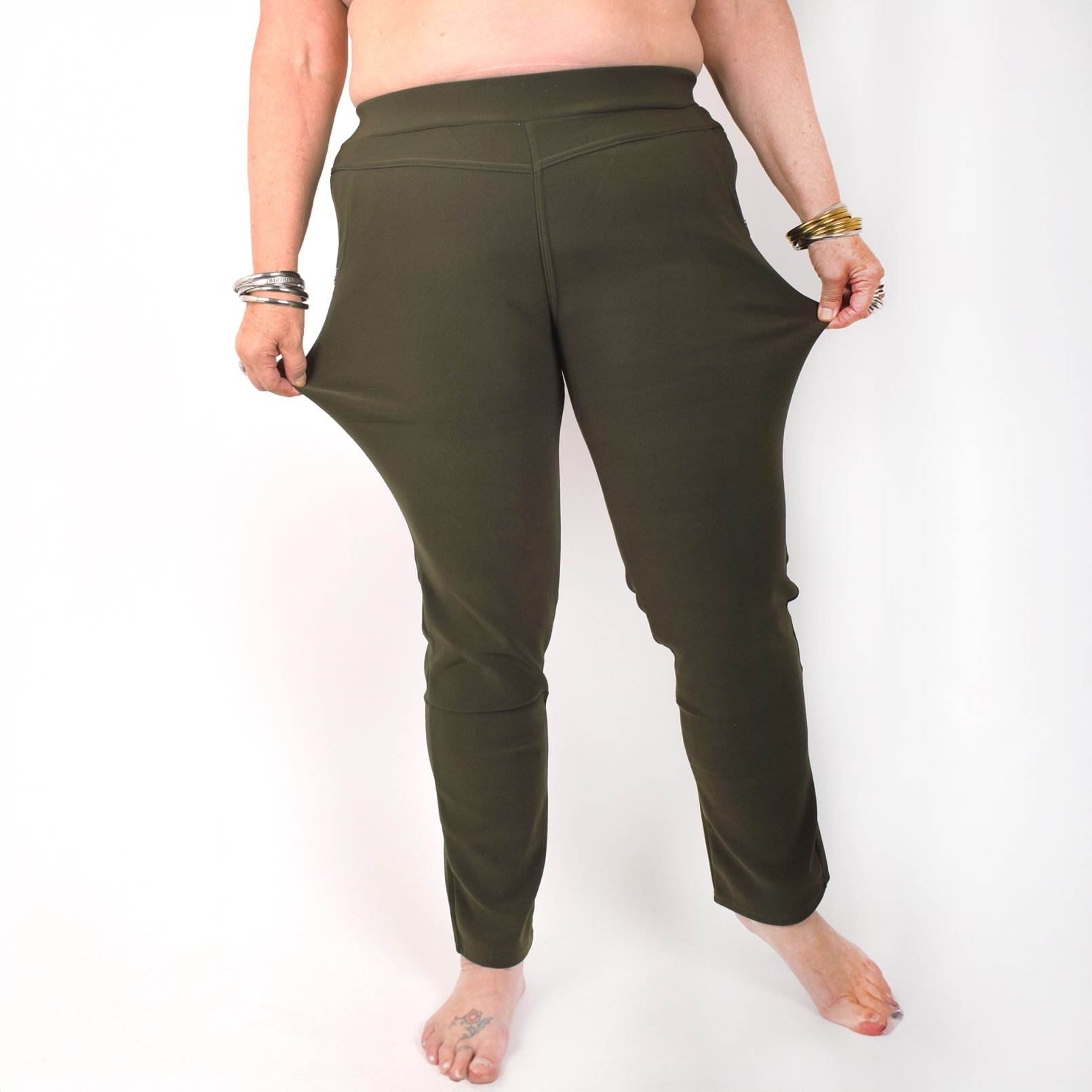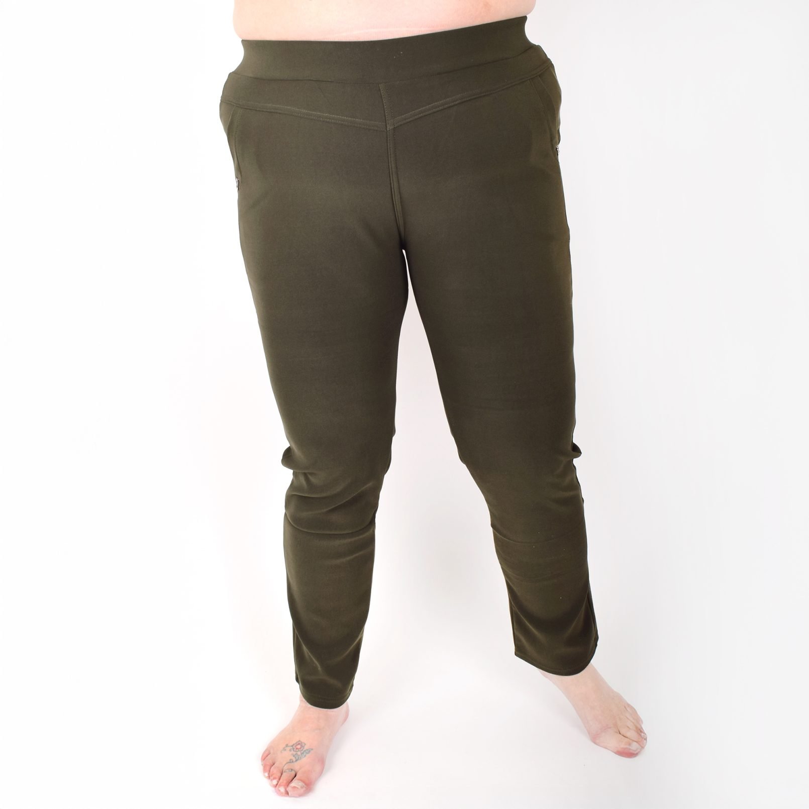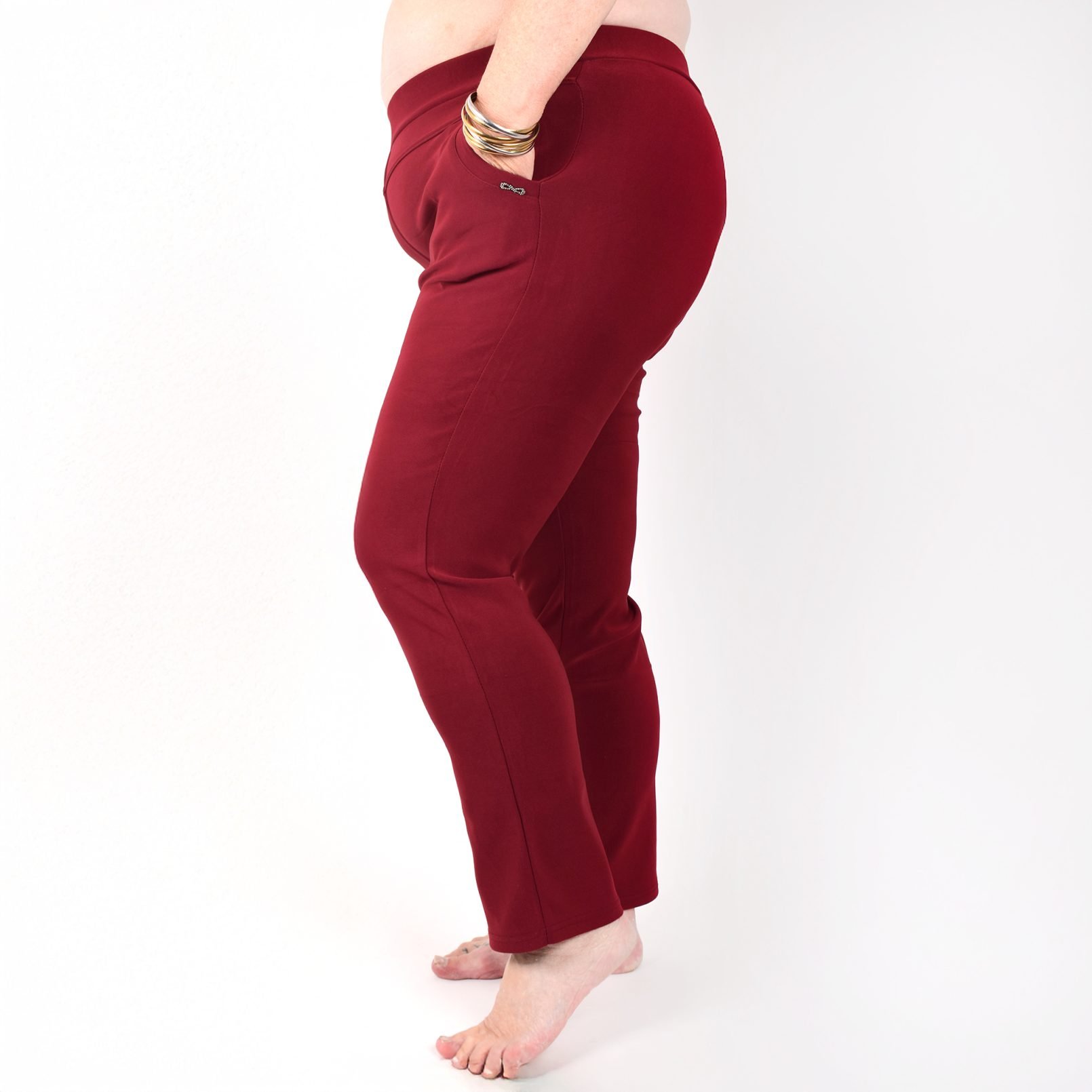 Stretchbyxor ’NINNA’ med detaj på fickorna. Fickor framtill. Bekväm passform, hög midja och superstretchigt material. Raka, lite avsmalnande ben. Stretchar ordentligt, så vill du ha tightare byxor kan du välja en storlek mindre än vanligt. Tvätta innan du tar byxorna i bruk. Maries (169 cm) storlek är XL. Byxornas längd är 110-104 cm och innerbenslängden 68-72cm.